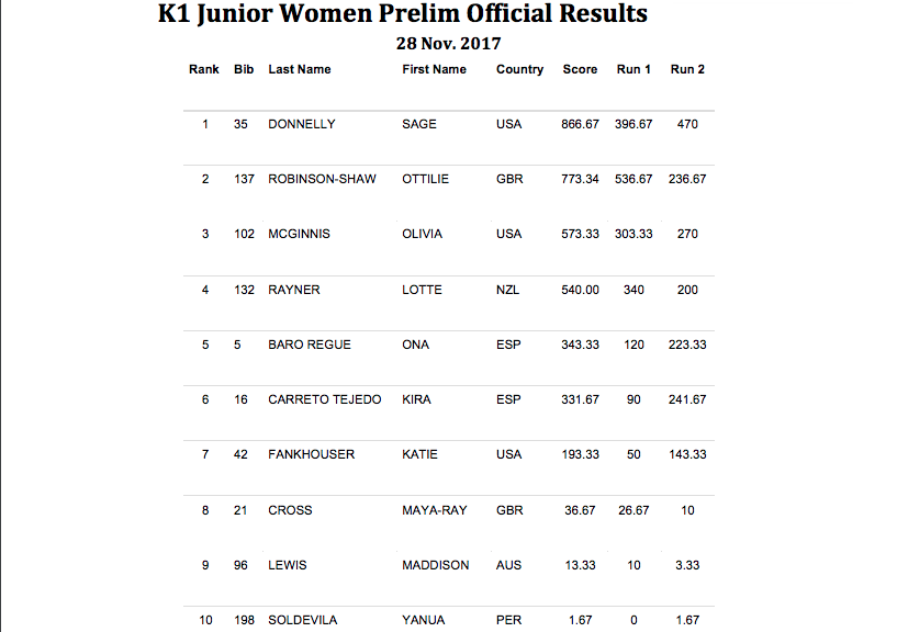2017 ICF Freestyle World Championships – Junior Women Prelims Results (Top 10 move to semi finals)