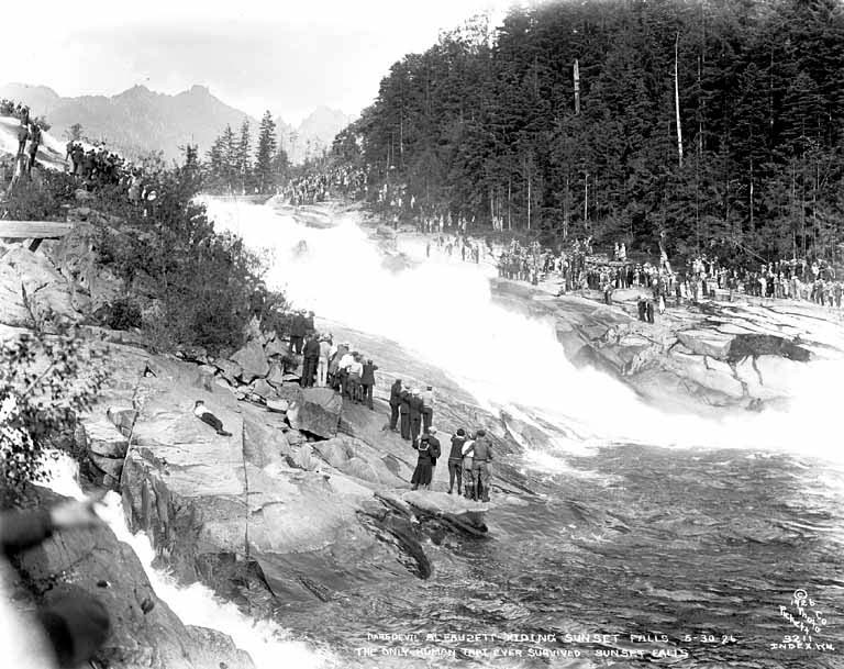 The original hair boater–Al Fausett–runs Sunset Falls. A crowd of 3000 gathered to watch the stunt. By permission: University of Washington Libraries. Manuscripts, Special Collections, University Archives Division.