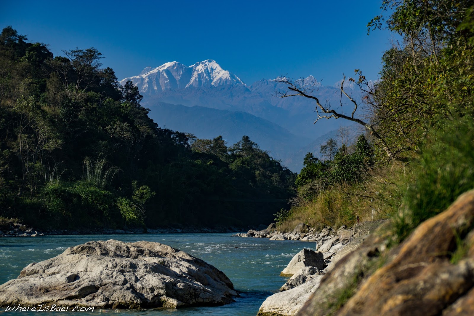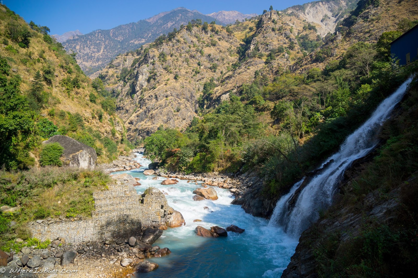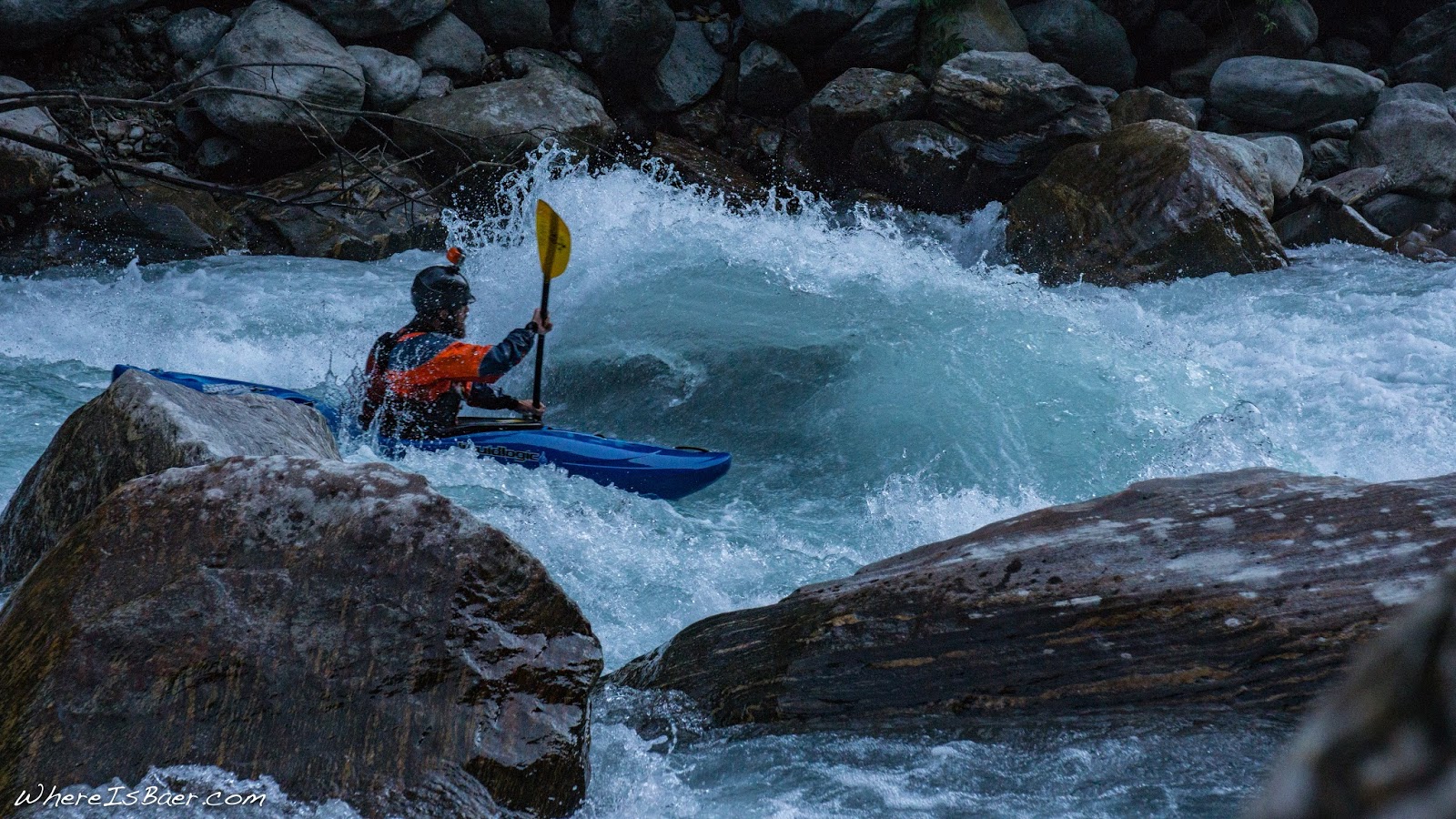 After two days of quintessential class 4, Justin Kleberg and I walked down the street from our hotel to the Annapurna Conservation Area permit office and doled out twenty dollars each to attain our special access permit. This would allow us to travel further up into the drainage. Four more miles up the road, we went to Lamjung and put on at the brink of yet another dam. Subsequently, the section had a portion of its water pulled out and through the hydro scheme. Although the section was partially dewatered, it had a slightly steeper gradient profile then the lower section. It was again spectacular class 4/4+ whitewater. The lines were significantly tighter with more river-wide, dynamic features then the lower section, but thankfully it was entirely boat scoutable.