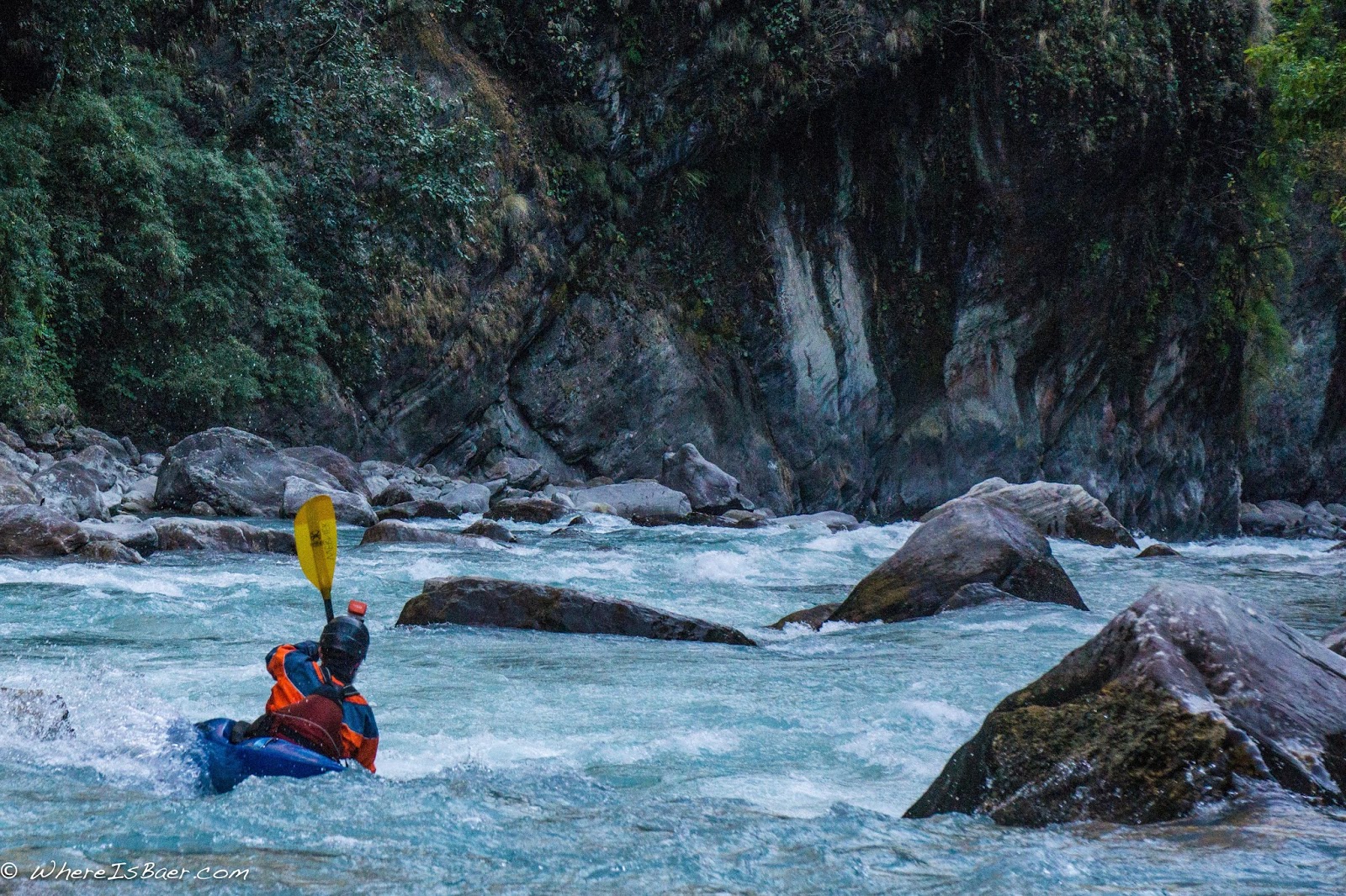 We were only a kilometer downstream from the put in when Garen hopped out of his kayak to take a peek at yet another horizon line. This time, he had a different look on his face. There was contemplation, and maybe a bit of concern, as he shouted to me, “you’re going to want to take a peek at this!” The rapid was rather heinous. There was definitely a line, but it looked like one of those rapids that you fired up the day after you broke up with your significant other. Portaging looked almost equally heinous. We were heading into an uncertain black hole, with overhanging boulders looming above, and a 45 degree slope of slippery rocks coated in dark slime that all angled down towards the massive siphon that was the cause of our hike in the first place. Then there was the cave-like rock structure that we shoved our boats through. Then we precariously maneuvered a thin rock ridge thirty feet above yet more siphons. Next up was a small jump across a death crevasse, followed by a steep, overgrown hillside full of thorns. That led quickly into a dry creek bed with plenty of ankle-rolling sized cobble stones, and even more overgrown vegetation. I leaned into the melee of foliage with all my weight but the flora proved unresponsive to gravity.