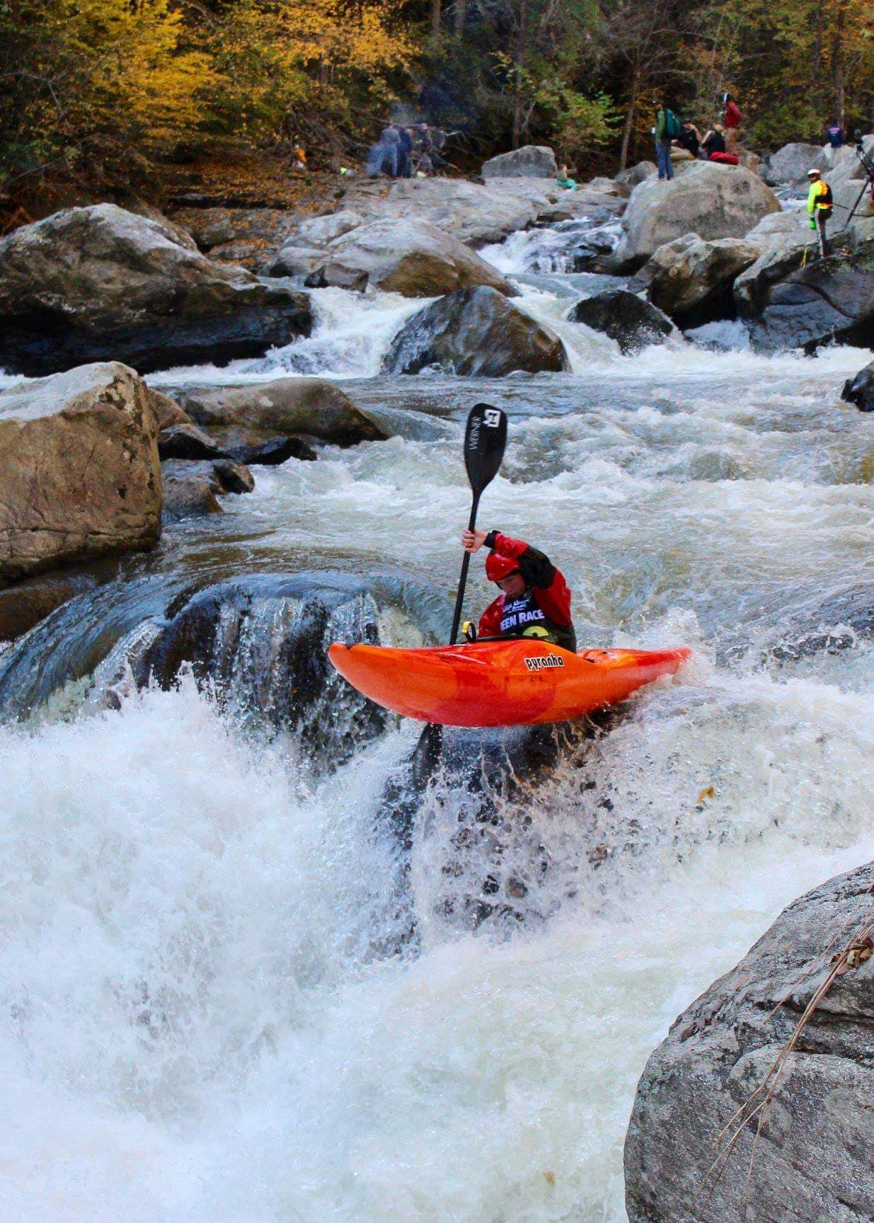 Tad Dennis is in tip-top shape: he’s been paddling hard all year and is well-versed in the high water Green. He’s won in C1 and it now looks like he’s aiming for the kayak crown. All of his years of slalom, like with Deguil, gives him precise boat control and an incredible stroke to move the boat downstream.
