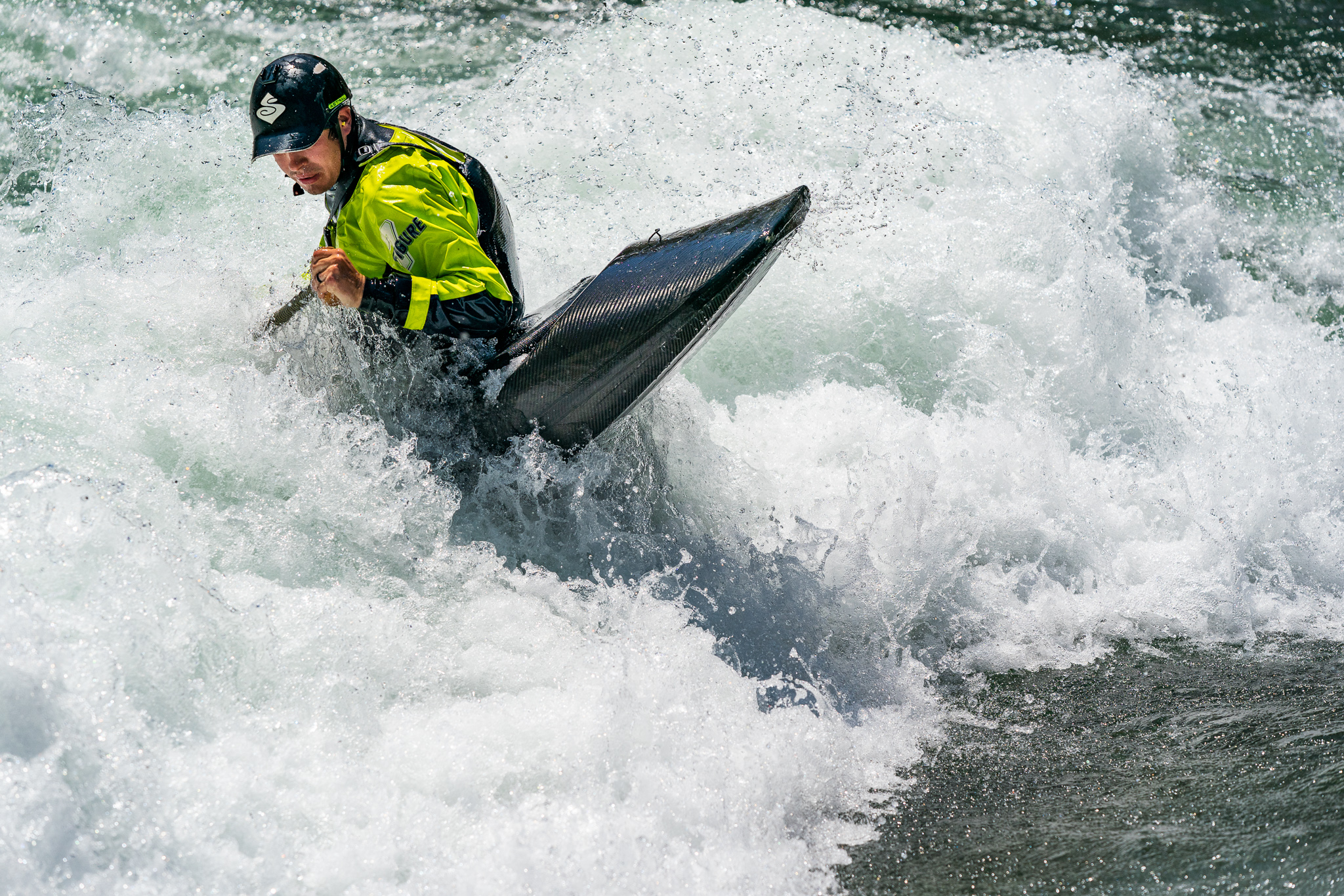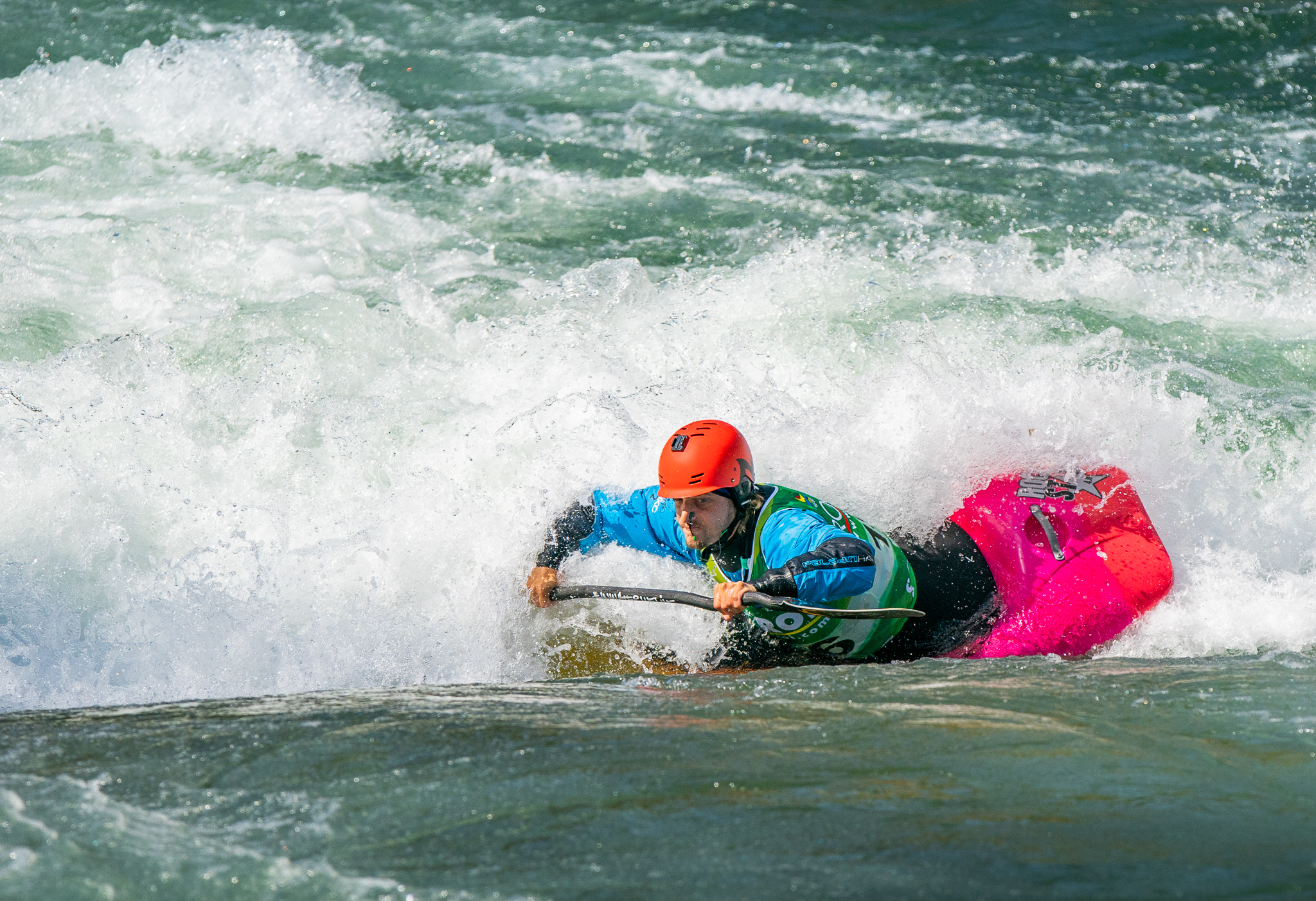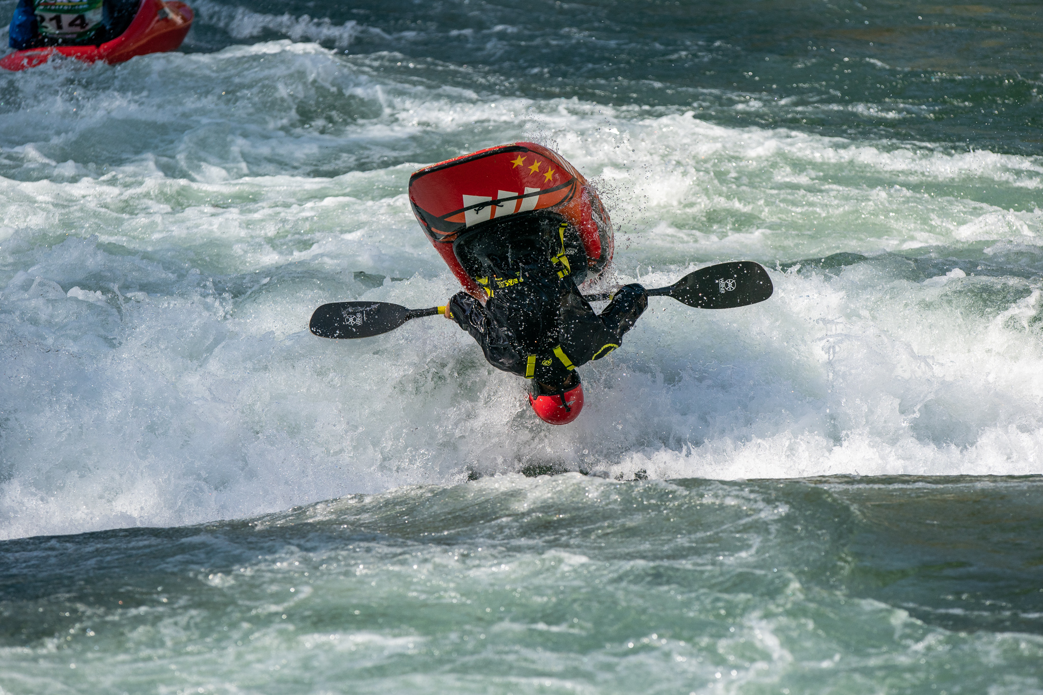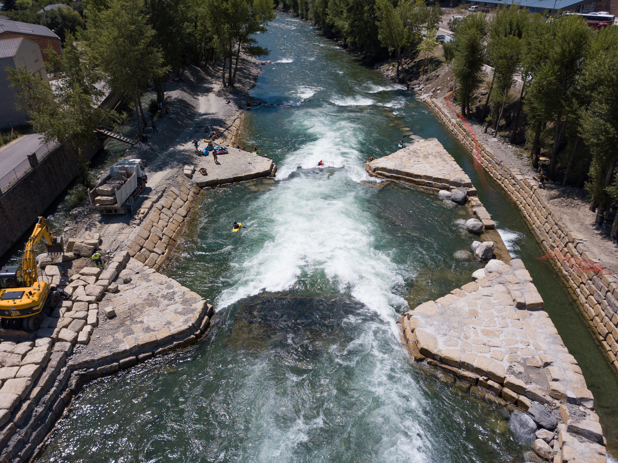 Twelve days ago there was an excavator in the riverbed moving around the boulders that form the feature in an effort to make it a little deeper.  The days following deliver a wide variety of flow rates as event officials and athletes debate ideal water levels for the upcoming world championships.  While the tricks are easier at lower flows, the resounding smack of a hull smashing on the river bottom makes everyone within earshot shudder.  Higher flows prove problematic as well.  Eight days before the kickoff the 2019 ICF World Championships, the feature is set and athletes are chomping at the bit to finalize their competition rides.
