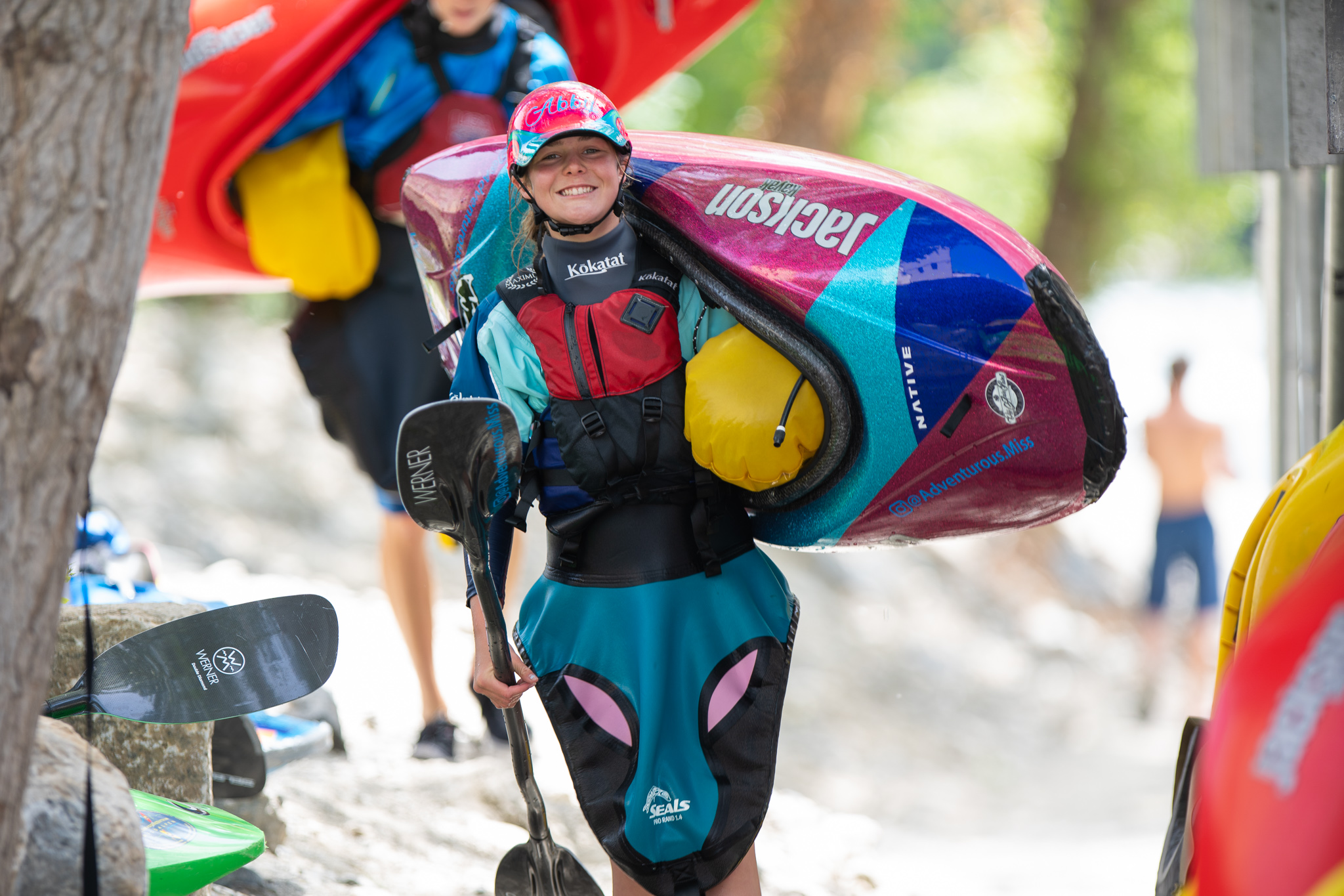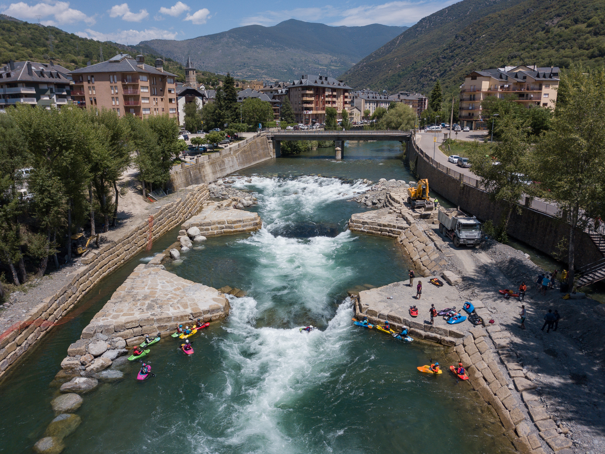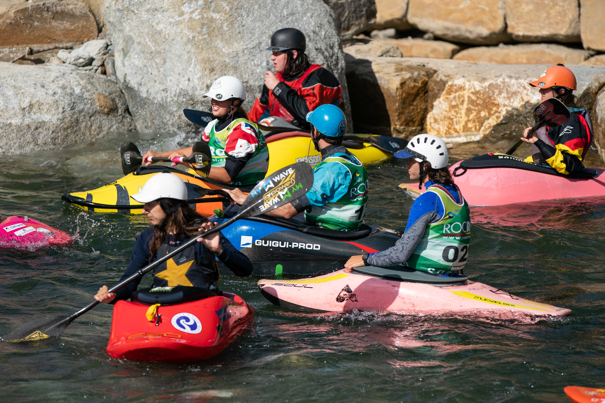 Twelve days ago there was an excavator in the riverbed moving around the boulders that form the feature in an effort to make it a little deeper.  The days following deliver a wide variety of flow rates as event officials and athletes debate ideal water levels for the upcoming world championships.  While the tricks are easier at lower flows, the resounding smack of a hull smashing on the river bottom makes everyone within earshot shudder.  Higher flows prove problematic as well.  Eight days before the kickoff the 2019 ICF World Championships, the feature is set and athletes are chomping at the bit to finalize their competition rides.