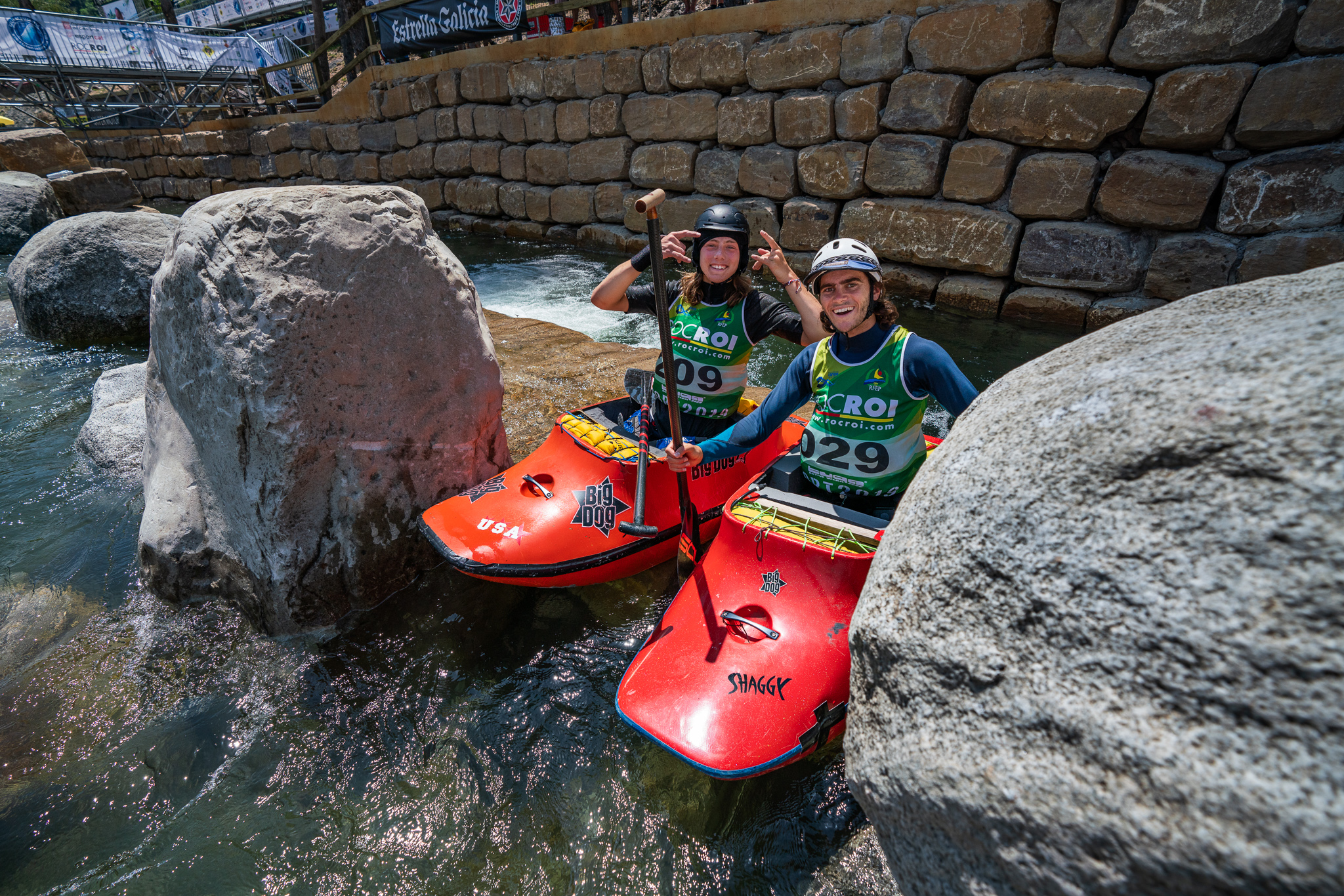 The afternoon kicked off as sixteen junior women from seven countries competed in their preliminary rounds, and these young women (age 15-18) are going huge.  McNasty’s, loops, cartwheels, space godzillas were just a few of the tricks they were throwing down.  Great Britain’s, Ottilie Robinson-Shaw claimed the top spot, but team USA was hot on her heals with all three of their athletes taking the next three positions:  Katie Fankhouser in 2nd, Olivia McGinnis in 3rd, and Abby Holcombe in 4th.  Local paddler Silvia Gallego from Spain placed fifth and was definitely a crowd favorite.