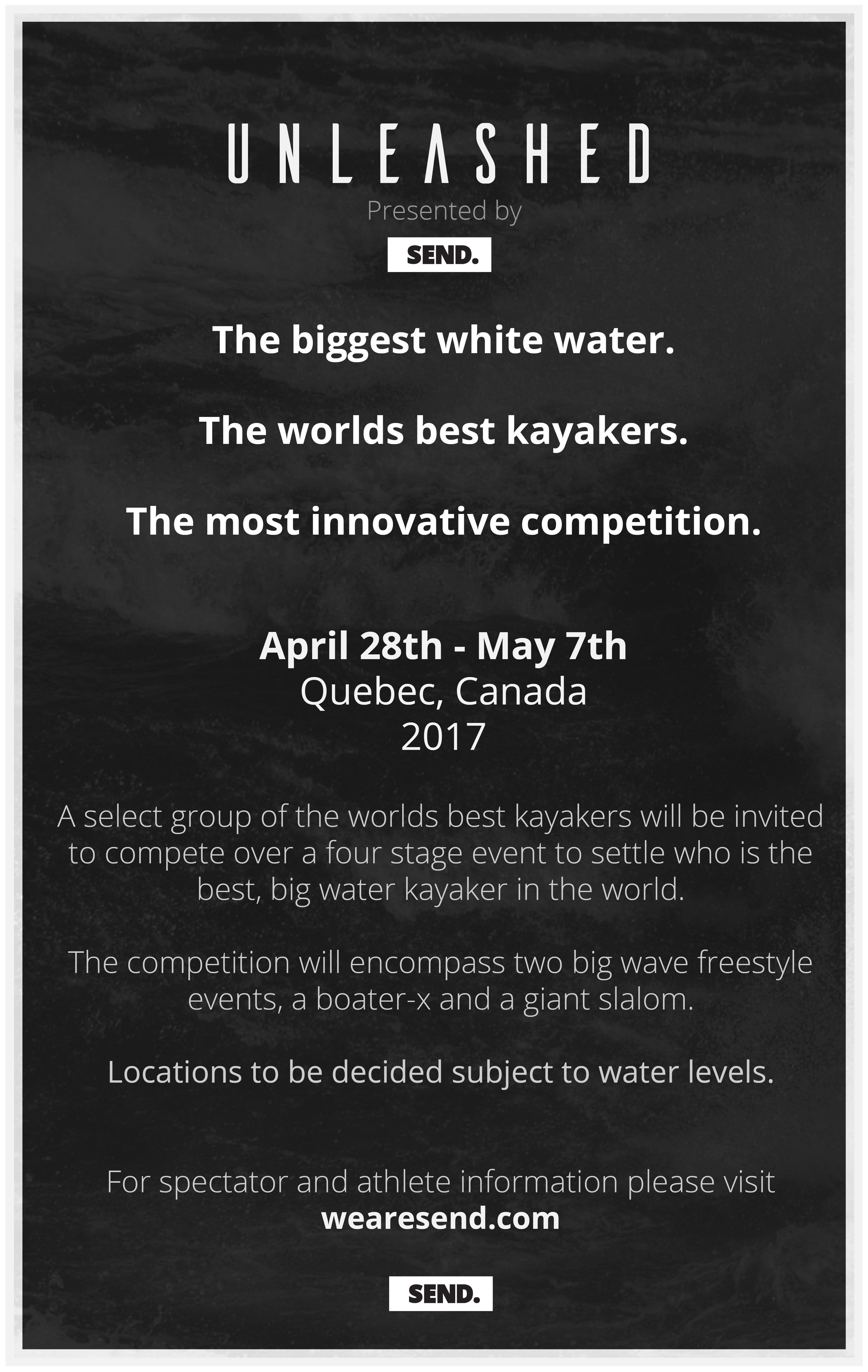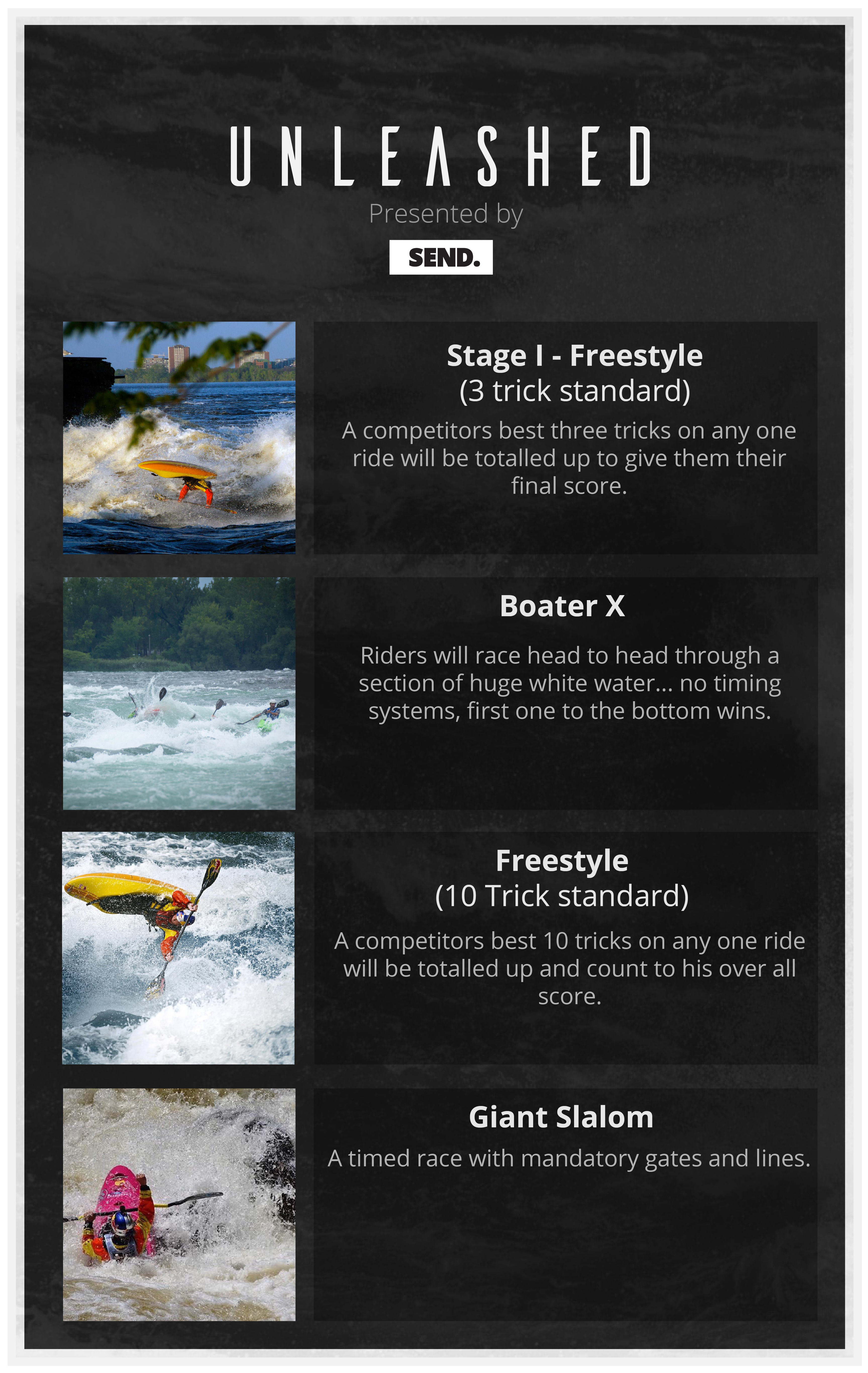 SEND: UNLEASHED is a four stage event, comprised of a three-trick standard big-wave event, a ten-trick freestyle event, a Boater-X, and a Giant Slalom, all taking place on the enormous spring flows of Quebec whitewater. We are especially excited about our new freestyle scoring system, which aims to place emphasis on style and amplitude as well as rewarding technical tricks and overall use of the wave.