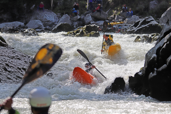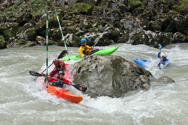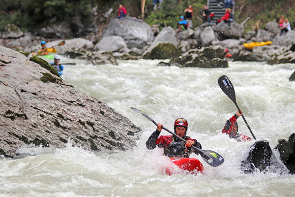 The K1 ladies race was won and lost at the gate in the Glaser corner. Susanna Halbach (AUT) was in the lead but was pushed off line and shut out by winner Pavlína Zasterova (CZE) and second place Lena Grüb (GER). Denise Rebenegger (AUT) finished fourth. Sabrina Barm (FRA) only just missed out in the first running of class C1 unisex at the Lofer Rodeo. After some initial troubles in the slalom-S, she battled in the Glaser corner and came out leading the final sprint. Pushed off line by the finishing waves, C1-veteran Martin Karabec CZE) was ready to capitalise on Barm’s mistake and passed her on the inside for the win. Third place went to Vilem Klepac (CZE) ahead of Bernhard Steidl (AUT).