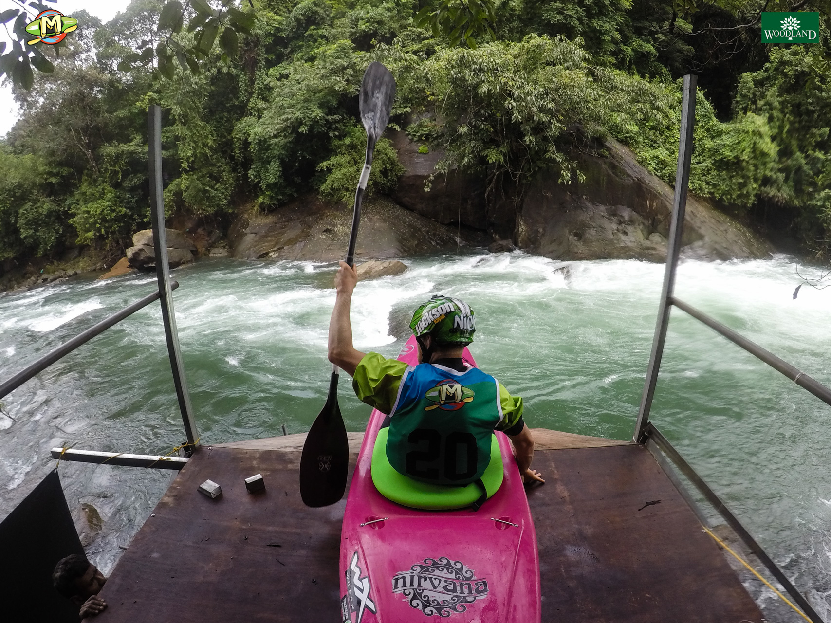 Shuttles drove away from Bulikayam early on Sunday morning, loaded with kayaks and people. A short hike down a narrow, stone-lined path opened up to the Iruvanjipuzha River and the impressive Malabar Express rapid, where a 20-foot ramp and hundreds of curious faces waited. Many of the athletes had only seen the Malabar Express at significantly higher flows earlier in the week, and were relieved to see the technical, grade 4+ rapid that waited. There was just enough time to dial in race lines and practice laps before the athlete briefing, the shuttle honking furiously as it wove its way through the congested streets.