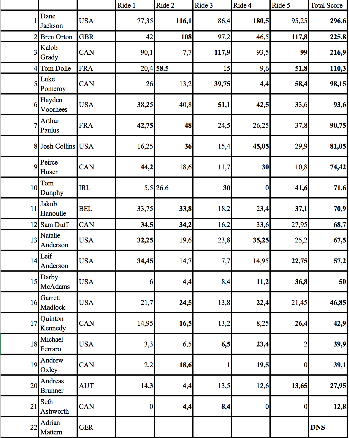 Rest Ride Freestyle format: (Score sheet below)