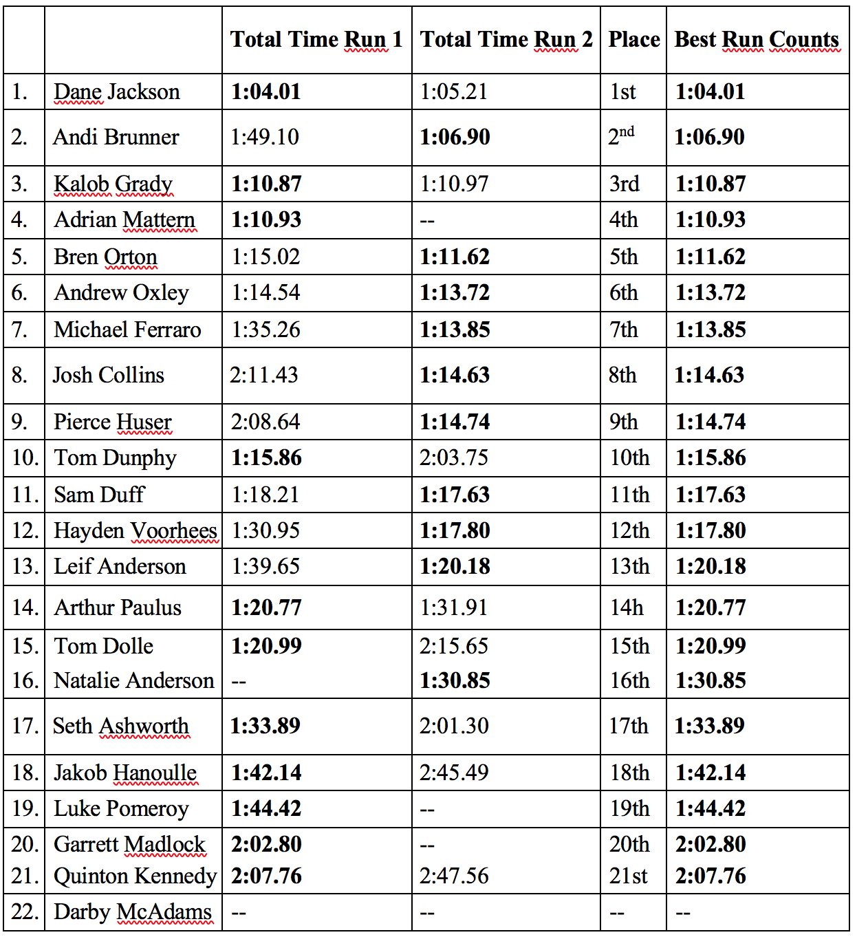 All riders were given 2 runs, with their fastest time of the 2 being counted. Although all racers were given 2 laps, not all took advantage of this privilege. Some took what they were given on lap 1, or were intimidated out of contention by the steep, difficult course.
